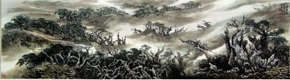 读张凌超的山水画,最初的印象是生机勃勃、明快靓现,继后你会感到雄强的气势中,一切是那样婀娜妩媚。当你步入画的深处,你能体验到作者的思绪,听到他的脉搏,在层层晕染,渐渐推进的演绎中领略到作品的诗意美。看到张凌超的胡杨作品“历尽沧桑” 、 “中流砥柱” 、 “幽境” 都是阳刚之气和阴柔之韵的和谐统一,是飘逸秀美和虚淡恬静的艺术境界,这境界包涵着“禅”意,是作者心中的“净土” 、是“天人合一” 的最高境界。
